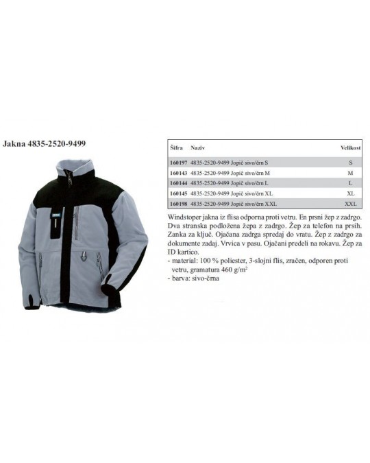 Windstoper jakna iz flisa odporna proti vetru. En prsni žep z zadrgo.Dva stranska podložena žepa z zadrgo. Žep za telefon na prsih.Zanka za ključ. Ojačana zadrga spredaj do vratu. Žep z zadrgo za dokumente zadaj. Vrvica v pasu. Ojačani predeli na rokavu. Žep za ID kartico.