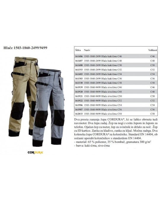 Dva prosta zunanja žepa CORDURA®, ki se lahko obrneta tudi navznoter. Dva žepa zadaj. Žep na nogi z extra žepom in žepom za telefon. Ojačan žep za meter, žep za svinčnik in držalo za nož. Žep za ID kartico. Zanka za kladivo, zanka za ključ. Močna zadrga. Dva kolenska žepa CORDURA® za kolenčnike. Standard EN 14404, ob sočasni uporabi kolenčnikov s standardom EN 14404.
