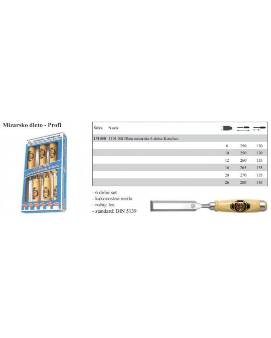 - 6 delni set- kakovostno rezilo- ročaj: les- standard: DIN 5139